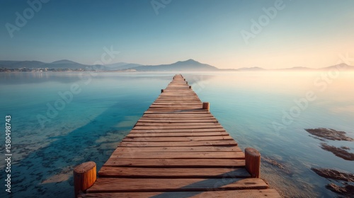 © ARTEMISIA, Obraz premium Wooden Pier Extending into Calm Ocean at Sunrise