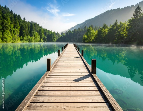 Naklejka premium Wooden Pier Extending into Lake - Nature scene - greenery