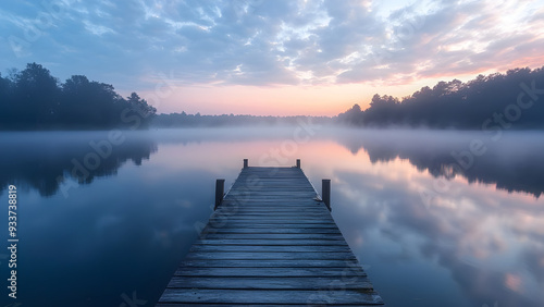 Naklejka premium Wooden Pier Extending into Misty Lake at Dawn.