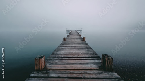 Fototapeta premium Wooden pier extending into misty lake, creating a tranquil background for meditation