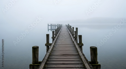 Fototapeta premium Wooden Pier Extending into Misty Lake, Leading to Mysterious Horizon