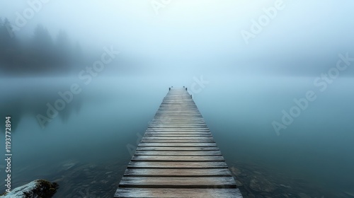© Fightstar, Obraz premium Wooden pier extending into misty lake with softly blurred edges