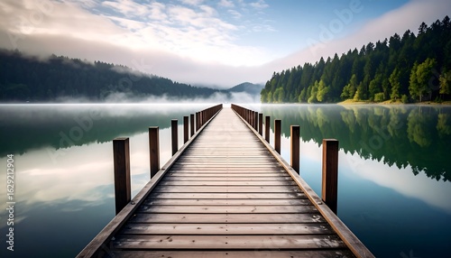 © Ana, Naklejka premium Wooden pier extending into serene lake with misty mountains and forest view.