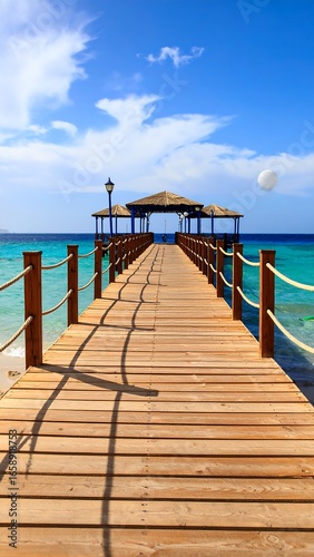 © Risti, Obraz premium Wooden pier extending into turquoise ocean, sunny day