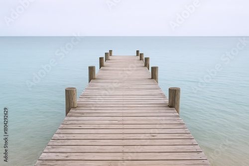 Fototapeta premium Wooden Pier Extending Over Calm Blue Ocean Waters, A Serene and Minimalist...