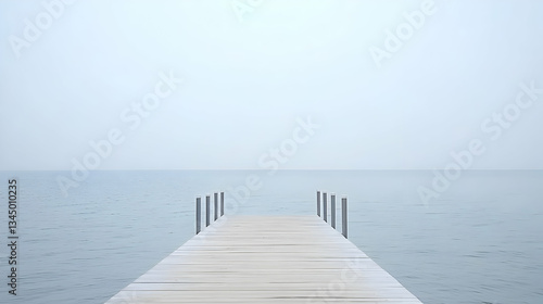 © Agusti, Obraz premium Wooden Pier Extending Over Still Water Towards Horizon Under Overcast Sky