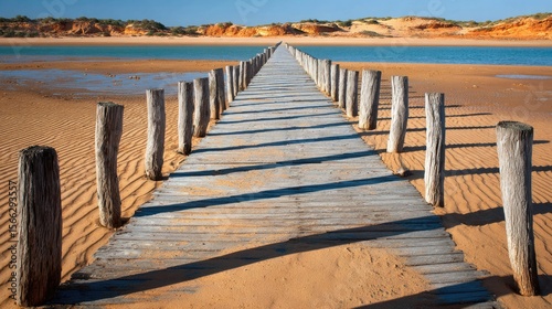 © Ginta, Obraz premium Wooden Pier Extending to Calm Ocean on Sandy Beach