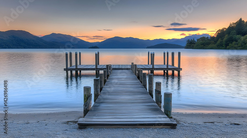 © artzone, Obraz premium Wooden Pier Extends Into Calm Lake Water at Sunset