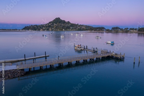 © Zenstratus, Obraz premium Wooden pier extends into calm water, boats moored nearby, tranquil coastal scene at dusk. Tairua, Coromandel Peninsula, New Zealand