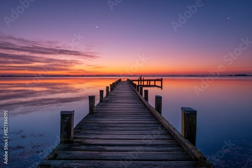 © ahmad, Fototapeta premium Wooden pier extends into still water under a pastel sunset sky with distant city lights