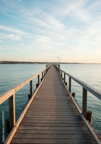 Fototapeta premium Wooden pier extends towards the under a serene sky.