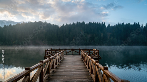 © CanYalicn, Fototapeta premium Wooden pier in Savsat Karagol Black lake in Eastern Black Sea region with morning evaporation. Savsat Karagol lake is a large trout lake in the forest in Artvin, Turkey