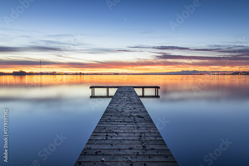 © Bram, Naklejka premium Wooden pier in the Zuiderhaven of Den Oever during a colorful sunrise. The sun announces its arrival by painting the horizon orange, while the visible star remains as a reminder of the night.