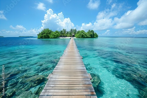 © Sandu, Naklejka premium Wooden pier leading into ocean with distant island
