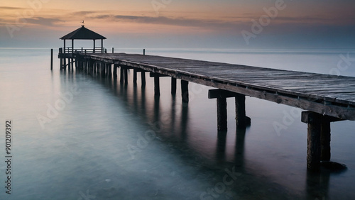 © woodbe, Obraz premium Wooden pier leading into the water at sunset