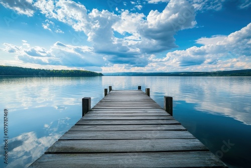 © Art Jabz, Fototapeta premium Wooden pier leading out into a calm lake with blue sky and white clouds.