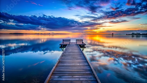 © Shopibizz, Fototapeta premium Wooden Pier Leading to a Calm Lake at Sunset with Stunning Colorful Evening Sky