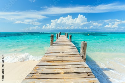 Fototapeta premium Wooden pier leading to the ocean with a white sand beach and turquoise water