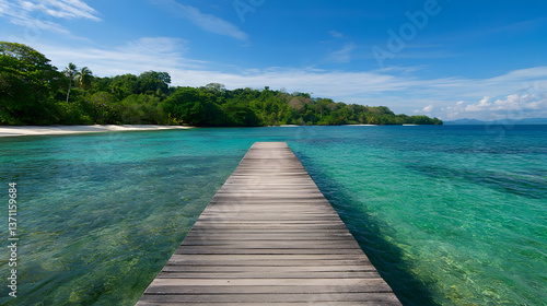 © predator, Obraz premium Wooden Pier Leading To Tropical Beach And Turquoise Water