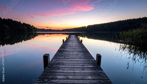 © Nur, Fototapeta premium Wooden Pier on Calm Lake Reflecting Vibrant Sunset Sky with Silhouette Trees and Distant Buildings