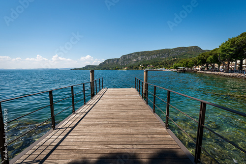 Obraz premium Wooden pier on Lake Garda (Lago di Garda) in front of the small town of...