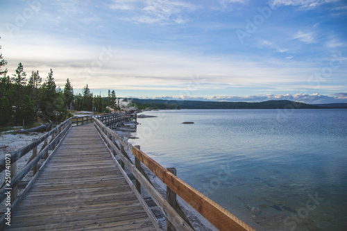 © Iryna Marienko, Naklejka premium Wooden pier on the beach of Yellowstone lake. Mountains view on background. Small forest on the side. Blue sky with some clouds and blue lake with geysers.