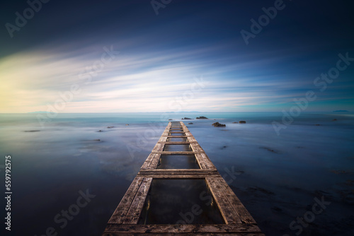 Fototapeta premium Wooden pier remains in a blue sea. Long Exposure.