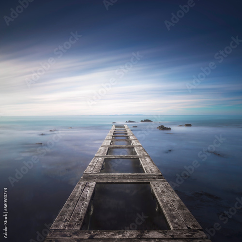 Fototapeta premium Wooden pier remains in a blue sea. Long Exposure.