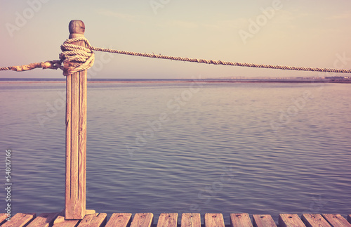 © MaciejBledowski, Obraz premium Wooden pier rope railing, selective focus, color toning applied.