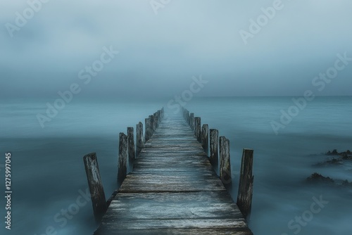 © jambulart, Fototapeta premium Wooden pier stretches into a misty ocean atmosphere.