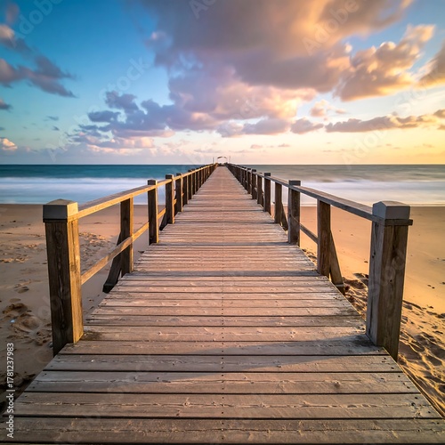 Obraz premium Wooden pier stretches towards the horizon under a colorful sky