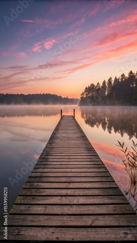 Fototapeta premium Wooden pier stretching into a tranquil lake reflecting a colorful sunrise sky...
