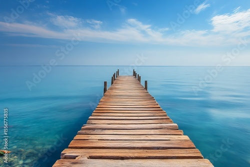 © inas, Fototapeta premium Wooden pier stretching into calm blue sea under clear sky, symbolizing tranquility and endless horizon