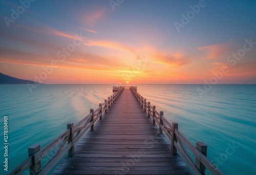 © Aleks, Fototapeta premium Wooden pier stretching into calm ocean waters with sunset colors creating peaceful seascape