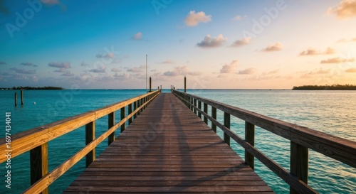 Obraz premium Wooden pier stretching into calm, turquoise ocean under a vibrant sunset