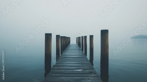 © ari, Naklejka premium Wooden Pier Stretching into Misty Lake