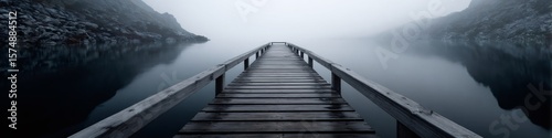 © Echt&KIreativ, Obraz premium Wooden pier stretching into misty lake surrounded by mountains
