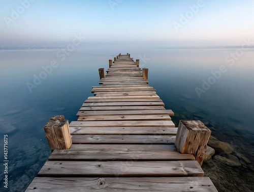 © Uud, Fototapeta premium Wooden pier stretching towards serene water on a tranquil misty morning