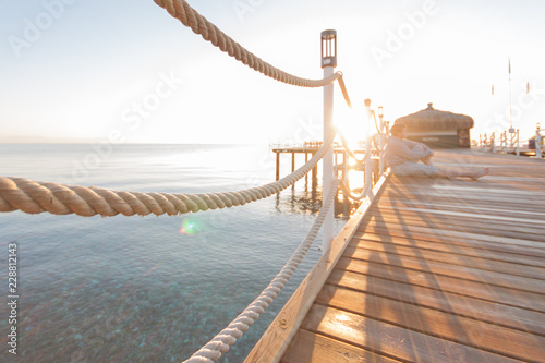 © Aleksandr, Fototapeta premium wooden pier sun-drenched, sunset or dawn, the silhouette of a man on a writing in the rays of the sun