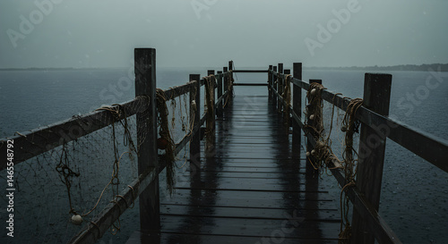 Obraz premium Wooden Pier Under Overcast Sky And Misty Rain Perspective Scene