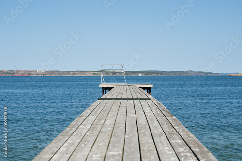 © Trygve, Obraz premium Wooden pier with a spring board waiting for the summer to arrive.