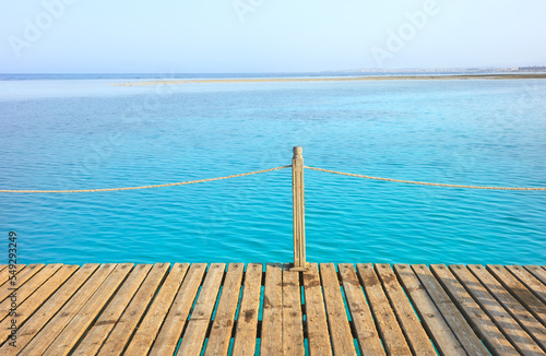 Obraz premium Wooden pier with rope railing, selective focus.