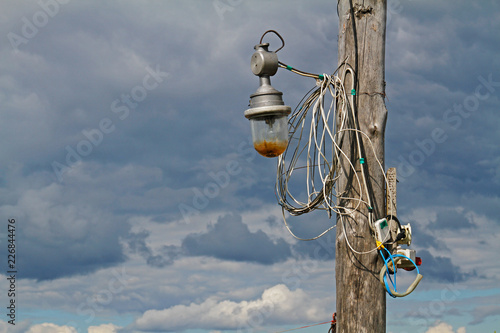 © yulyao, Fototapeta premium Wooden pillar with old lantern and wires against the sky with clouds