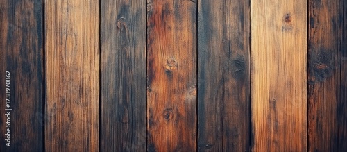 Naklejka premium Wooden plank wall texture in various shades of brown with natural grain patterns and knots for background use Copy Space
