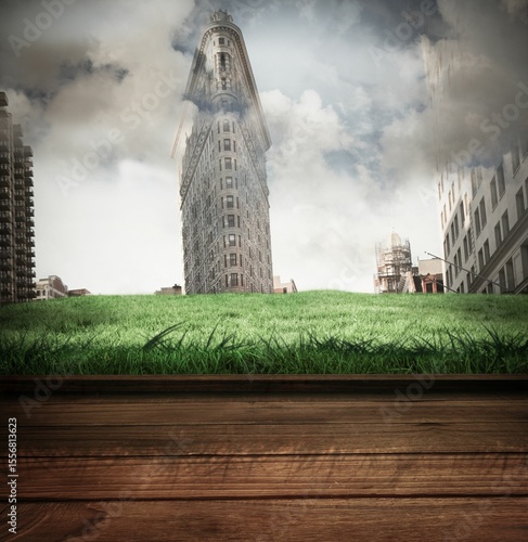 © vectorfusionart, Fototapeta premium Wooden planks against new york