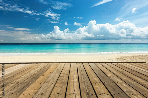 Fototapeta premium Wooden planks form a pier stretching over the blue sea towards the horizon...