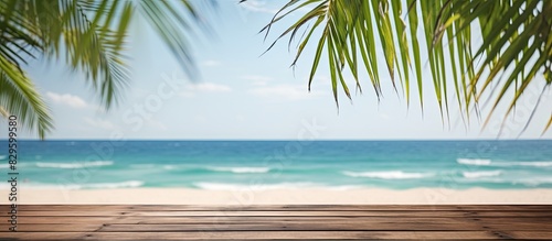 Fototapeta premium Wooden planks with a blurred beach in the background are suitable for product placement with palm leaves in the foreground providing copy space image opportunity