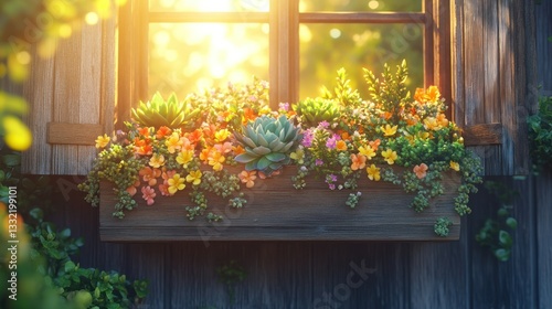 Fototapeta premium Wooden planter box overflowing with colorful succulents and flowers, bathed in warm sunlight streaming through a window