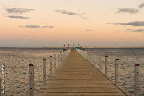 © Angelov, Obraz premium Wooden pontoon at sea, Golden sea sunset.