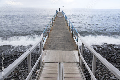 © Iva, Fototapeta premium Wooden port pier with fisherman silhouette on the end, wild ocean with waves, Funchal, Madeira, Portugal